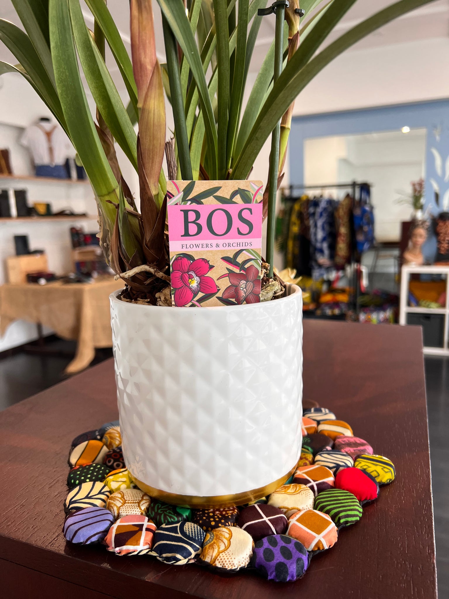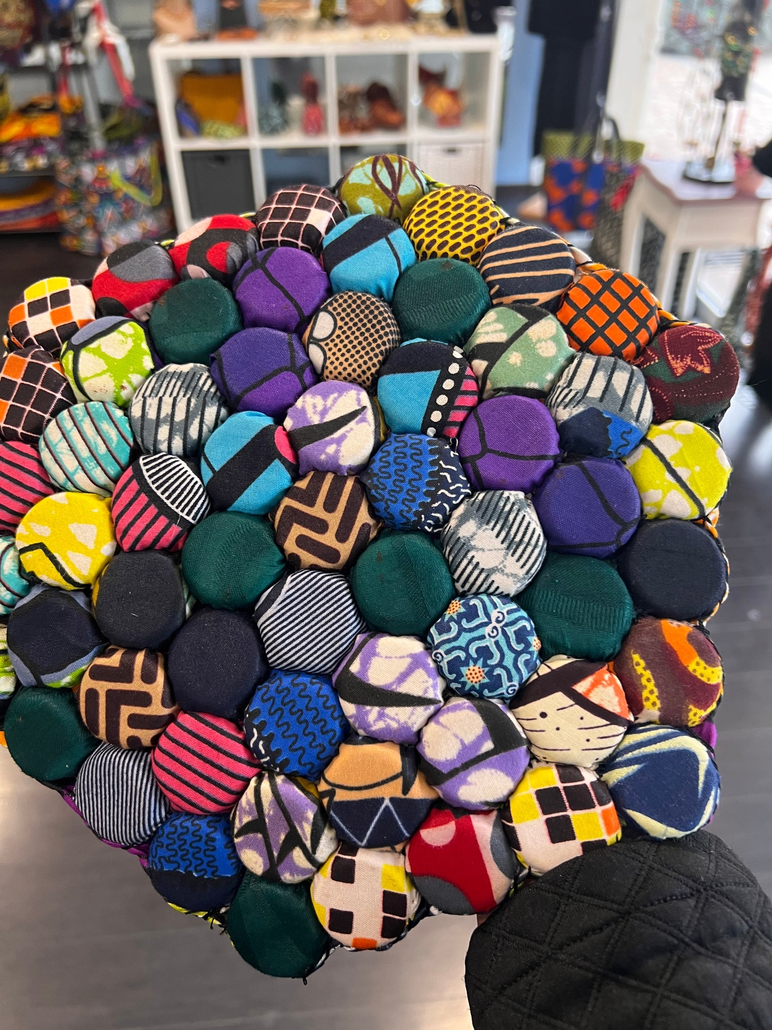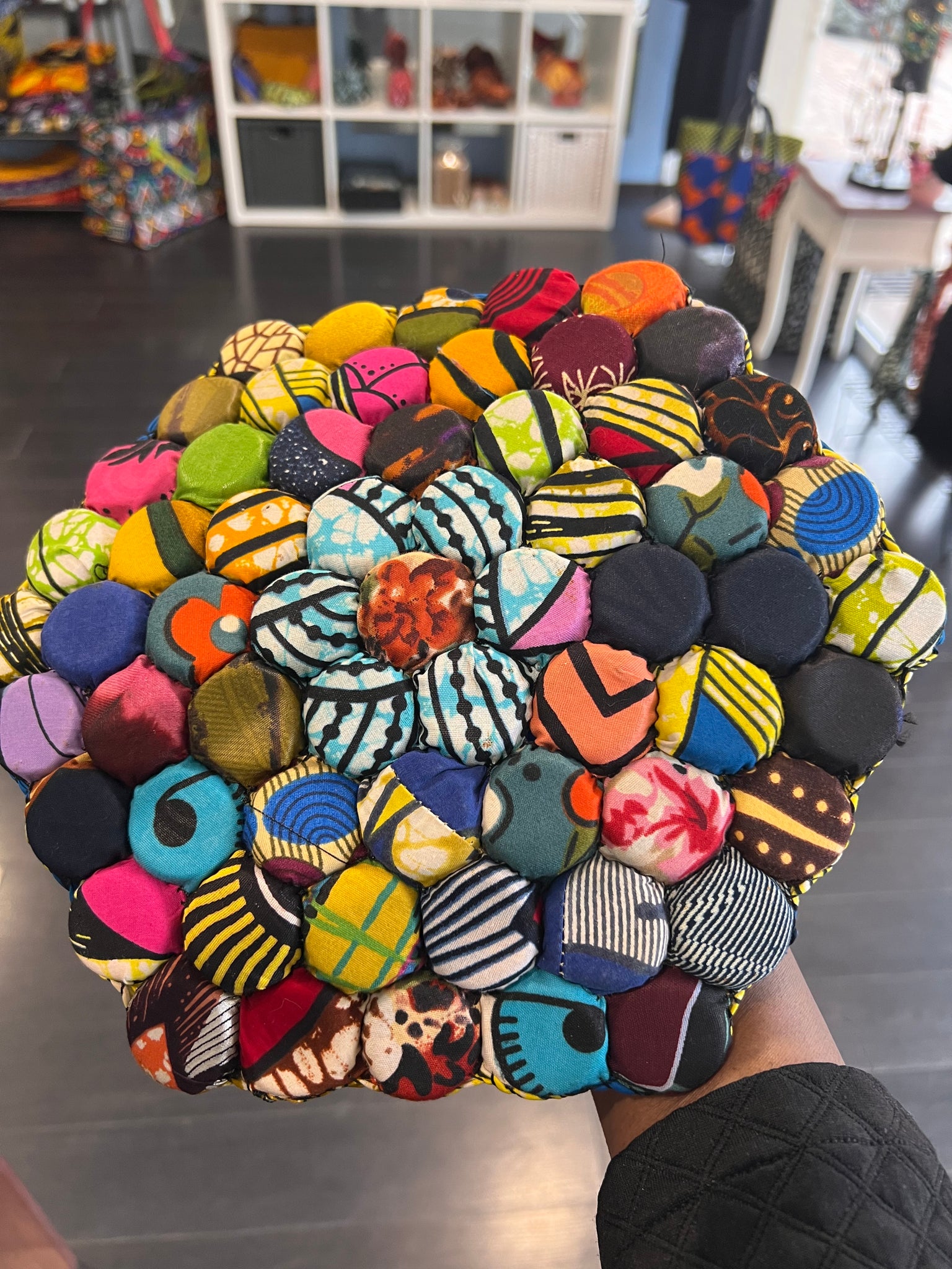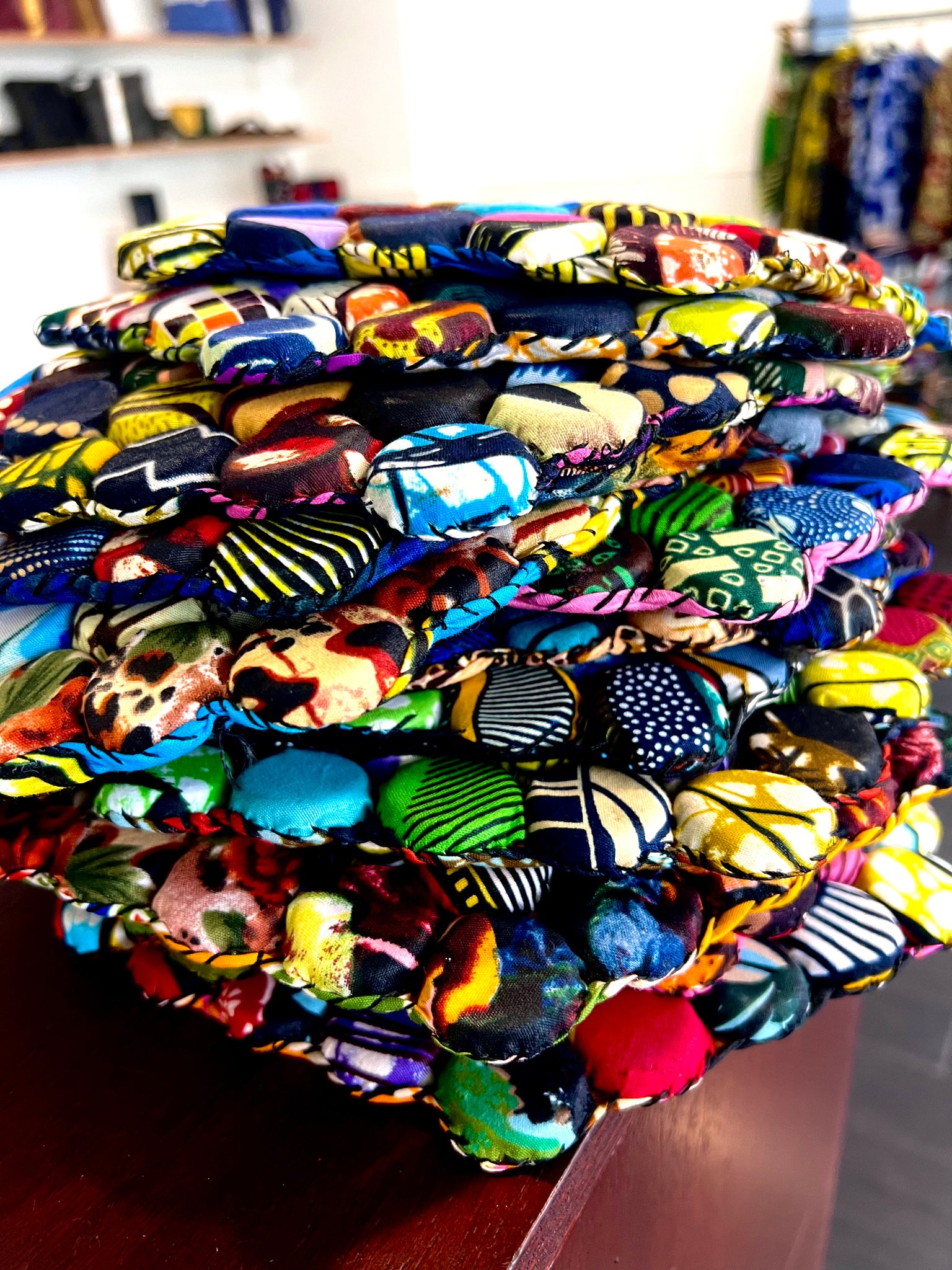 cette pièce s’utilise comme centre de table ou dessous de plat à vos de créer votre univers . Fabriquée à partir des capsules et des chutes de tissus en Wax .